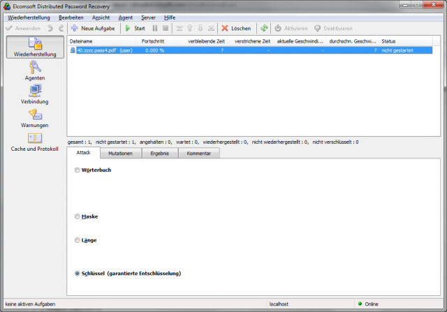 Elcomsoft Distributed Password Recovery (EDPR) Haupt-Bildschirm Deutsche Oberflaeche
